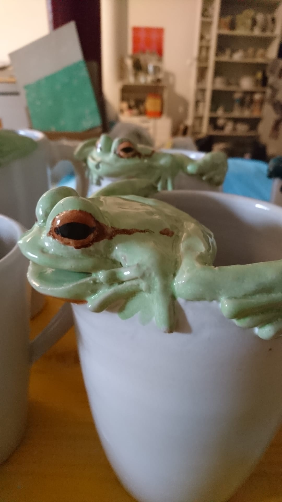 Steinzeug mit Aufglasurmalerei Diese Wasserkaraffen sind praktisch beim servieren von Eiswasser. Die Eiswürfel werde dabei vom Frosch zurückgehalten, während das Wasser durch den Froschmund abfliest.